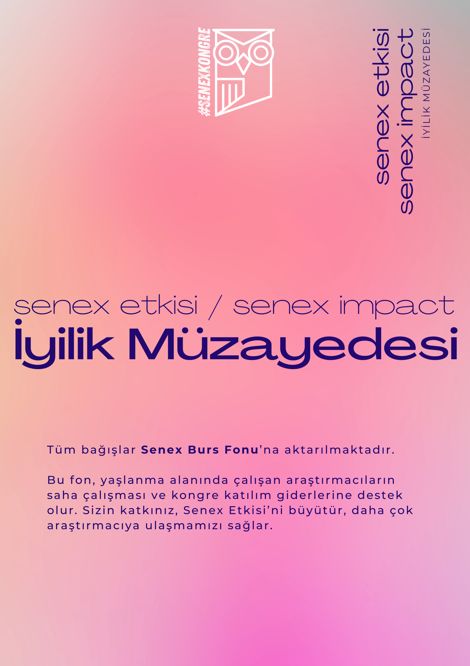 Senex Impact / Senex Etkisi: İyilik Müzayedesi, katılımcıların ürün ve deneyimlere teklif vererek Senex’e bağış sağladığı bir dayanışma etkinliğidir. Açılış Forumu ardından başlayan İyilik Müzayedesi’nde yer alan ürünler için teklifler kongre süresince sessizce, teklif kartları üzerinde verilir. En yüksek geçerli teklifi verenler ürünleri /deneyimleri kazanır; elde edilen tüm gelir şeffaf ölçütlerle dağıtılan Senex Burs Fonu’na aktarılır. Bu fon, yaşlanma alanında çalışan araştırmacıların saha çalışması ve kongre katılım giderlerine destek olur. Sizin katkınız, Senex Etkisi’ni büyütür, daha çok araştırmacıya ulaşmamızı sağlar.